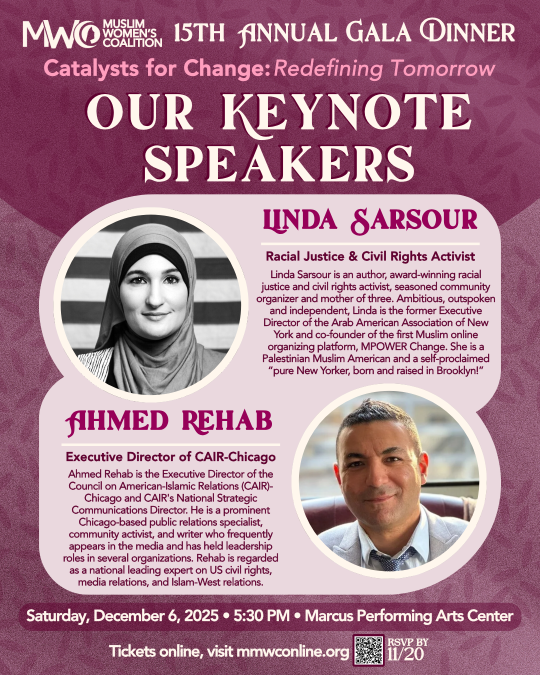 Our keynote speakers include Linda Sarsour, a nationally recognized racial justice and civil rights activist, and Ahmed Rehab, Executive Director of CAIR-Chicago and a leading voice on civil rights and media representation.