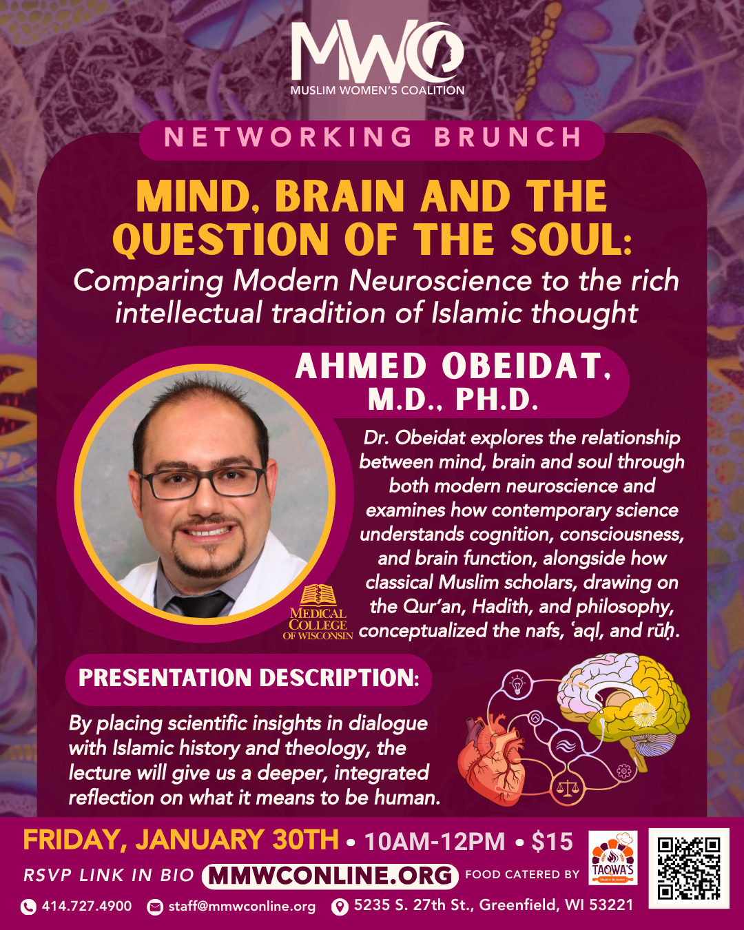 Dr. Obeidat explores the relationship between mind, brain and soul through both modern neuroscience and examines how contemporary science understands cognition, consciousness, and brain function, alongside how classical Muslim scholars, drawing on the Qur’an, Hadith, and philosophy, conceptualized the nafs, ʿaql, and rūḥ.