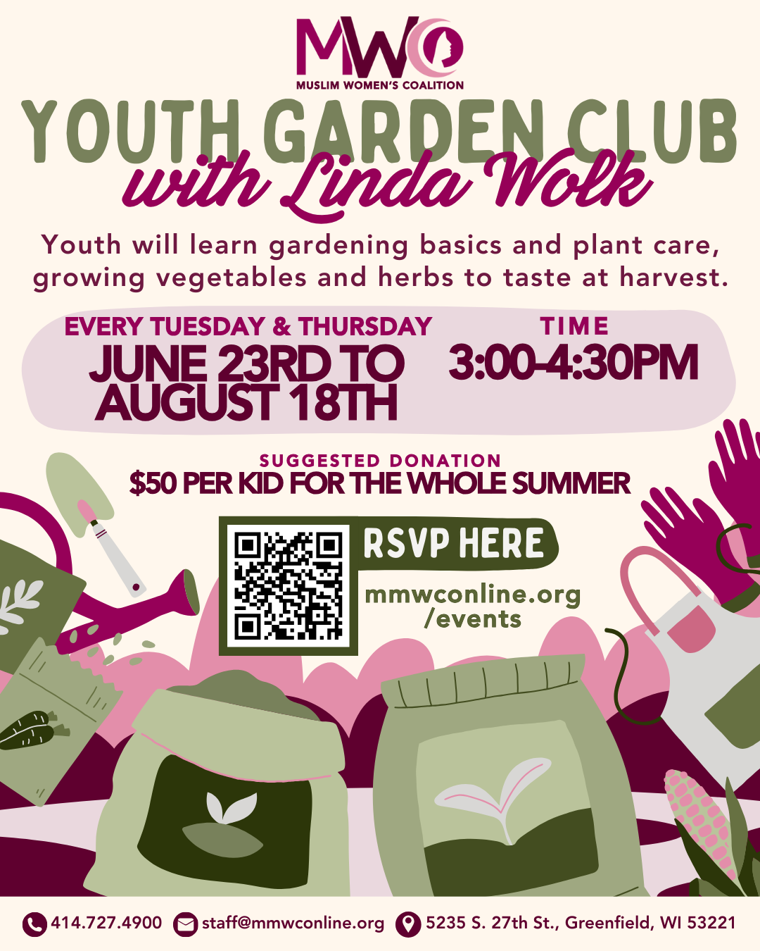 The Muslim Women's Coalition is excited to host its 4th annual Youth Garden Club! Programming is led by Linda Wolk, MWC's Youth Garden Teacher, Professional Florist, Lifelong Gardener!