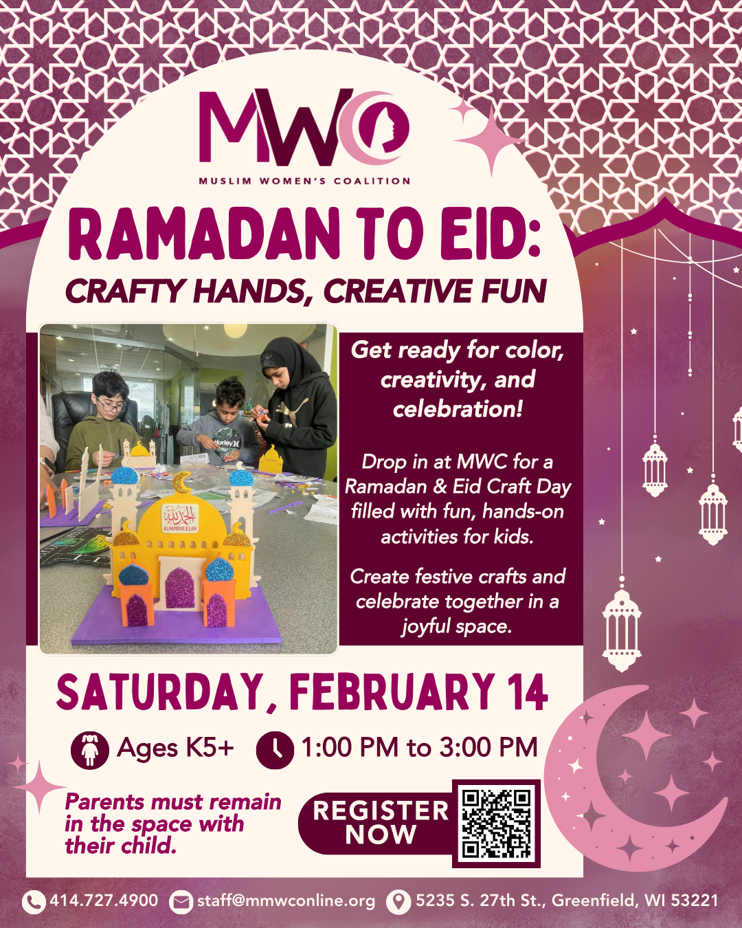 Get ready for color, creativity, and celebration! Drop in at MWC for a Ramadan & Eid Craft Day filled with fun, hands-on activities for kids.